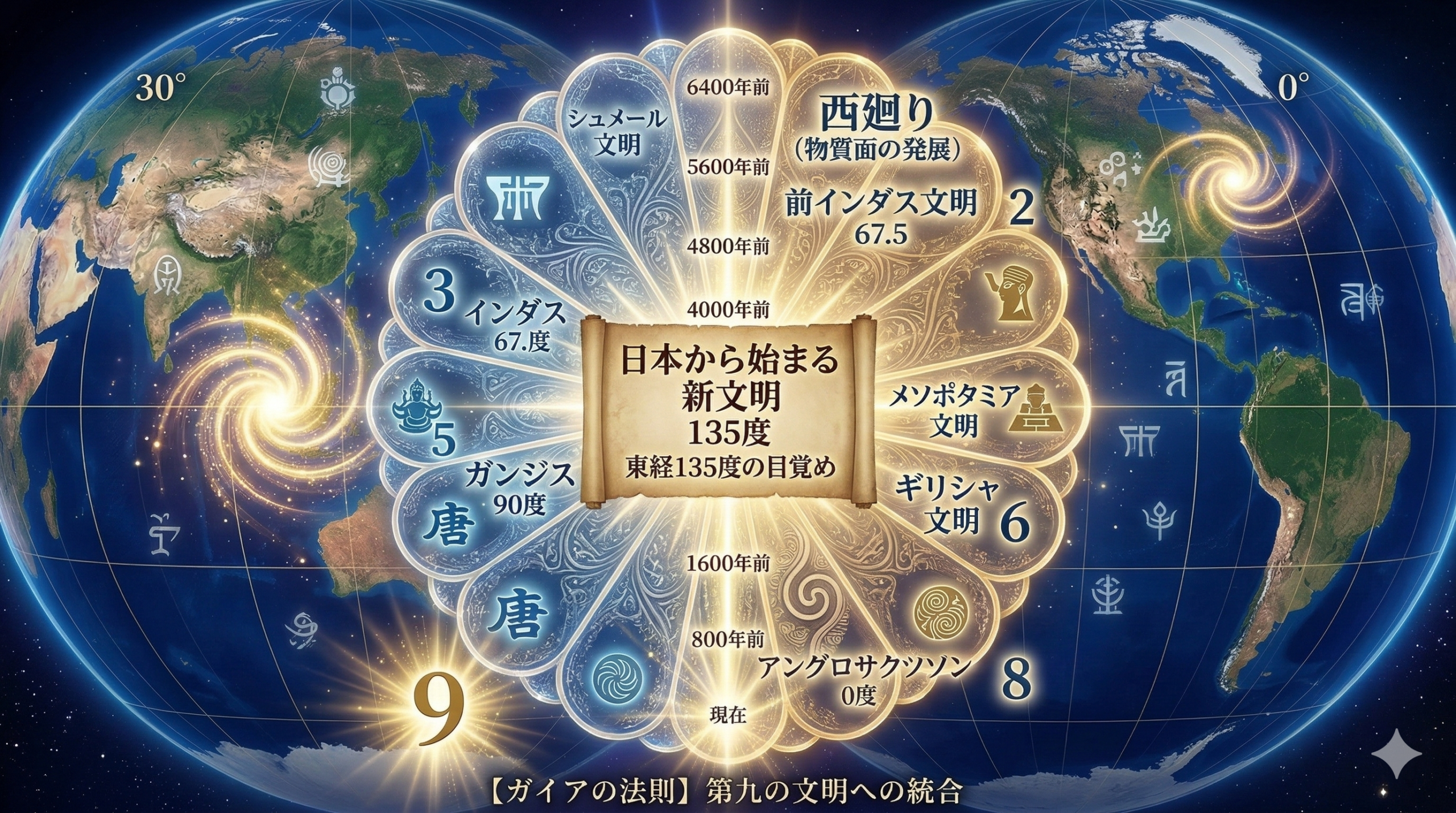 アングロサクソンの時代(0度)が終わり、135度の日本が動き出す。 これは単なる予測ではなく、数千年前からプログラミングされていた**「ガイアの必然」**なのです。