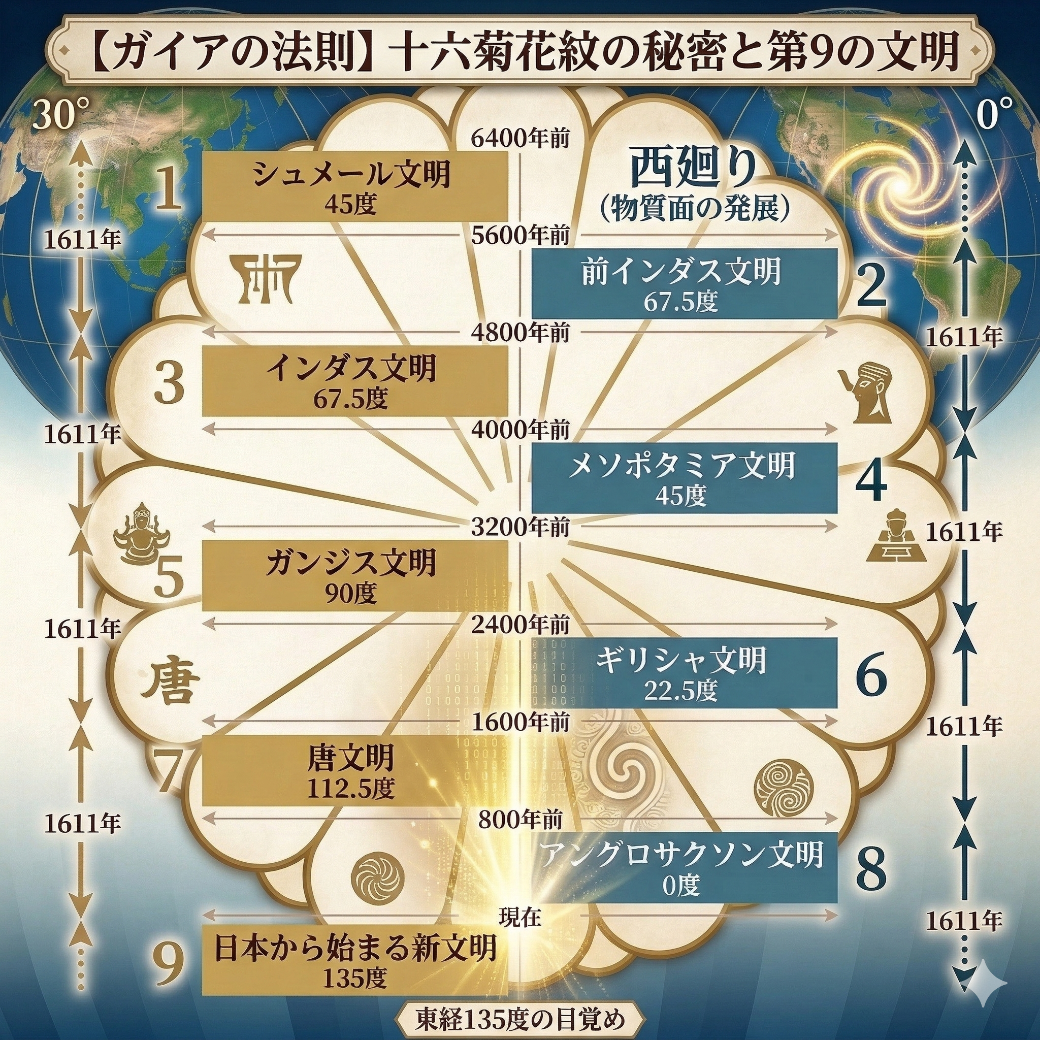 なぜ、日本の紋章は「16」の花弁なのか。 それは、地球を16分割したこの「聖なるリズム」を、私たちが忘れぬよう刻まれた「文明の設計図」だったのかもしれません。
