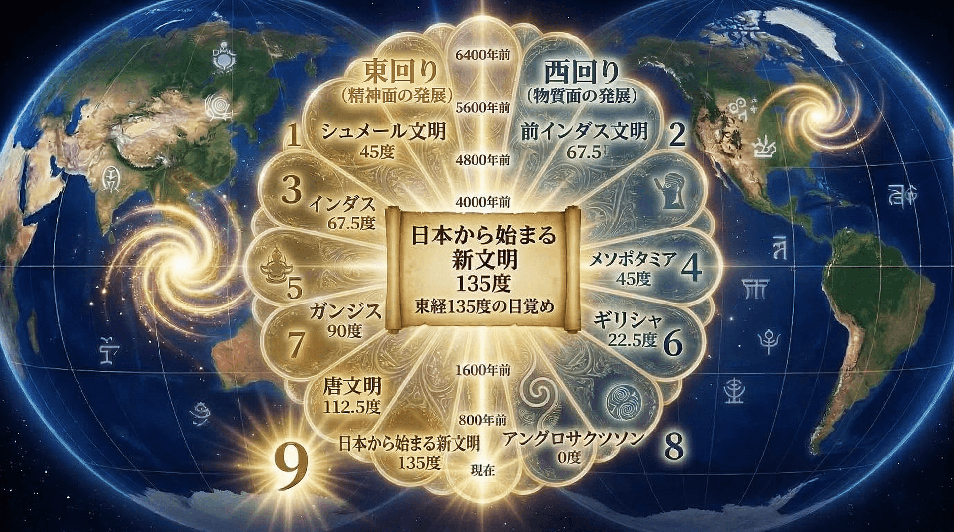 現在のロンドン(0度)を中心とした物質文明が限界を迎え、バトンは今、地球の反対側である東経135度(日本)へと渡されました。